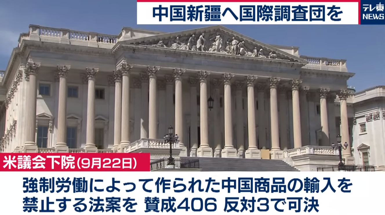一方、アメリカの議会下院は22日、新疆での少数派民族の扱いに対処するため、中国で強制労働力によって作られた商品の輸入を禁止する法案をほぼ満場一致で可決した。成立には上院での可決も必要になるものの、中国に対する圧力を強めている。