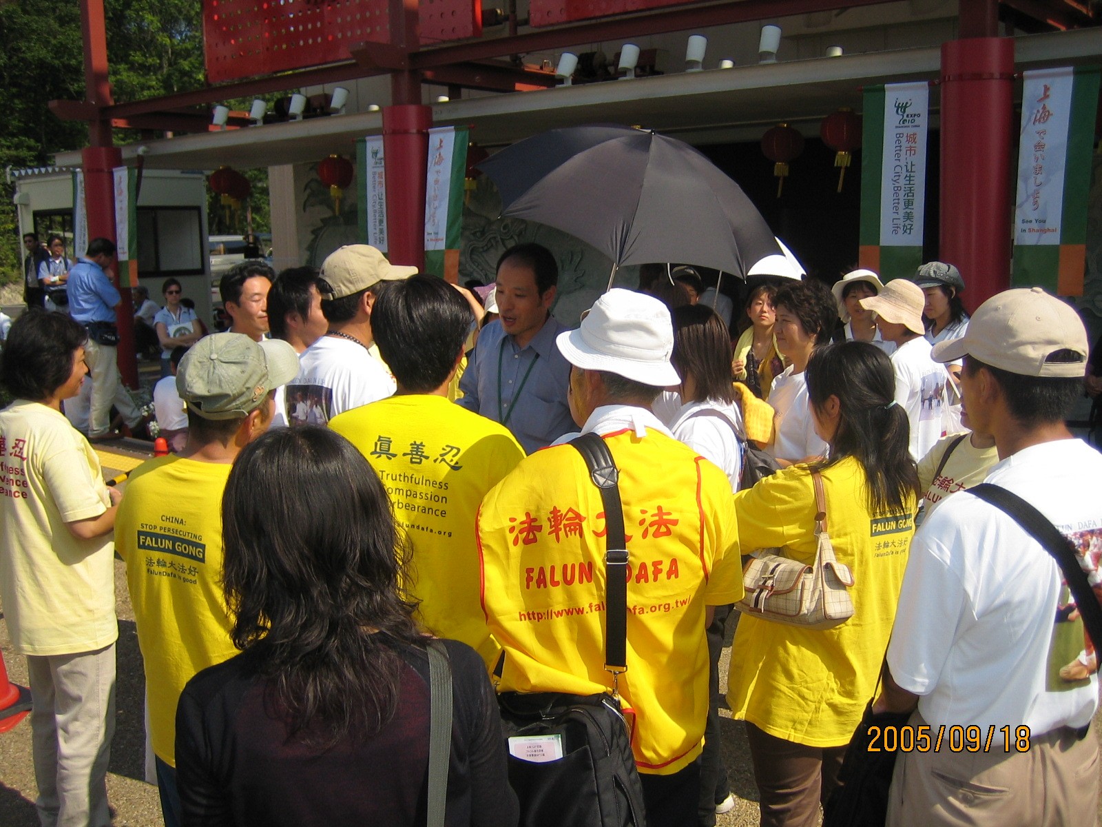 万博開幕の翌日(3月26日)、韓国の法輪功学習者が「法輪大法」と書かれたTシャツを着て入館しようとしたところ、入館を拒否された。