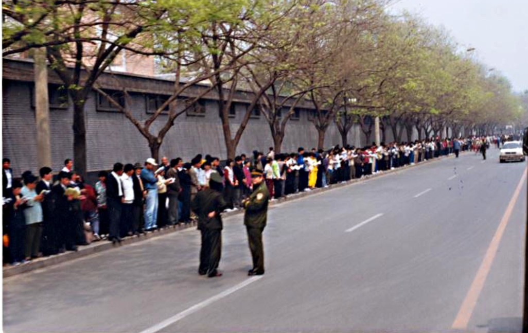 25日、北京の中南海近くの国務院信訪局(陳情局)に着いた法輪功愛好者は1万人を超えたが、静かに整然と道沿いに並び、スローガンも無ければ横断幕も無く、平和的なやり方で彼らの代表と陳情局が面談するのを待っていた。